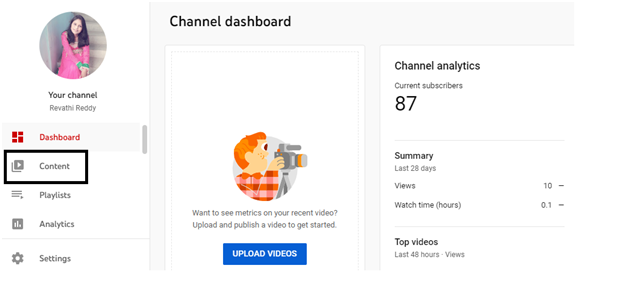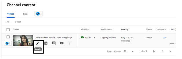 - 步驟 1 − 點選內容,你將進入頻道內容頁面(如下所示)。你會看到一個影片列表。選擇要新增到播放列表中的任何一個影片。這裡我只有一個影片。點選詳細資訊符號(如影像所示)。