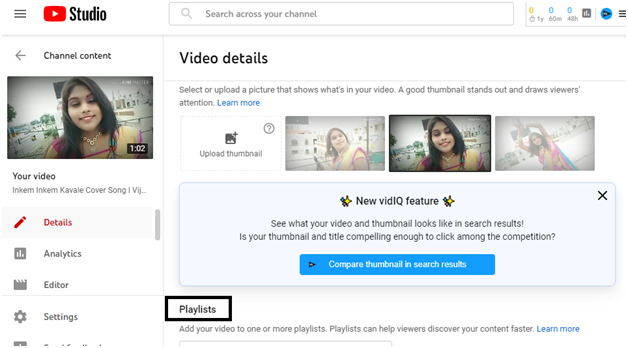 - 步驟 2 − 點選詳細資訊符號後,將開啟影片詳細資訊頁面。向下滾動,在縮圖部分頁面底部。你會找到播放列表類別。