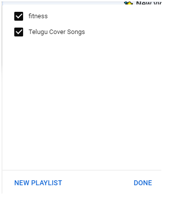 - 步驟 4 − 點選選擇,會出現一個下拉選單。將顯示已建立的播放列表列表。這裡我只建立了一個播放列表。因此,我只顯示了一個播放列表名稱。如果你想新增影片,可以選中播放列表的複選框,或者可以點選新建播放列表按鈕。