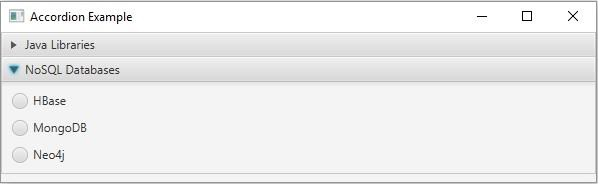 可以透過例項化 javafx.scene.control.Accordion 類在 JavaFX 中建立 手風琴。getPanes() 方法返回在當前手風琴中包含所有面板的列表。