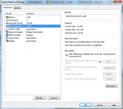 # fdisk -l Disk /dev/sda: 21.5 GB, 21474836480 bytes 255 heads, 63 sectors/track, 2610 cylinders Units = cylinders of 16065 * 512 = 8225280 bytes Sector size (logical/physical): 512 bytes / 512 bytes I/O size (minimum/optimal): 512 bytes / 512 bytes Disk identifier: 0x000c664e Device Boot Start End Blocks Id System /dev/sda1 * 1 64 512000 83 Linux Partition 1 does not end on cylinder boundary. /dev/sda2 64 2611 20458496 8e Linux LVM Disk /dev/sdb: 21.5 GB, 21474836480 bytes 255 heads, 63 sectors/track, 2610 cylinders Units = cylinders of 16065 * 512 = 8225280 bytes Sector size (logical/physical): 512 bytes / 512 bytes I/O size (minimum/optimal): 512 bytes / 512 bytes Disk identifier: 0x00000000 Disk /dev/mapper/VolGroup-lv_root: 18.8 GB, 18798870528 bytes 255 heads, 63 sectors/track, 2285 cylinders Units = cylinders of 16065 * 512 = 8225280 bytes Sector size (logical/physical): 512 bytes / 512 bytes I/O size (minimum/optimal): 512 bytes / 512 bytes Disk identifier: 0x00000000 Disk /dev/mapper/VolGroup-lv_swap: 2147 MB, 2147483648 bytes 255 heads, 63 sectors/track, 261 cylinders Units = cylinders of 16065 * 512 = 8225280 bytes Sector size (logical/physical): 512 bytes / 512 bytes I/O size (minimum/optimal): 512 bytes / 512 bytes Disk identifier: 0x00000000