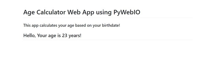 我們指定了年齡計算器的主函式。此函式首先獲取輸入,然後使用 datetime 模組計算使用者的年齡(以年為單位)。最後,使用 PyWebIO 的輸出函式在網頁上顯示結果。