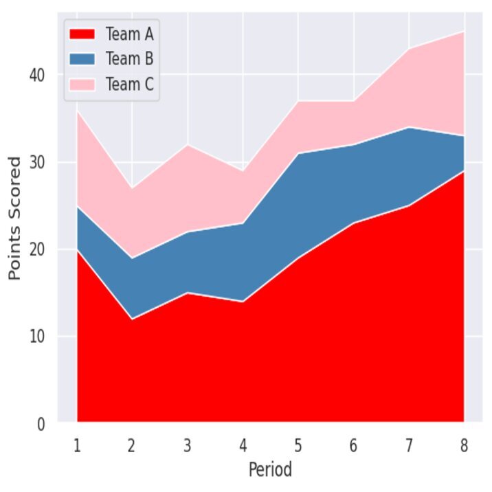 此程式碼使用 Python 中的 Matplotlib 和 Seaborn 庫建立面積圖。定義一個包含三個團隊在八個階段得分的資料框,並設定 Seaborn 樣式。stackplot 函式建立面積圖,新增圖例和軸標籤,然後顯示圖表。