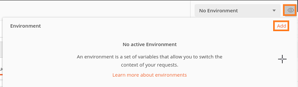 步驟 1 − 單擊“無環境”下拉選單旁邊的眼睛圖示,然後單擊“環境”部分中的“新增”連結。