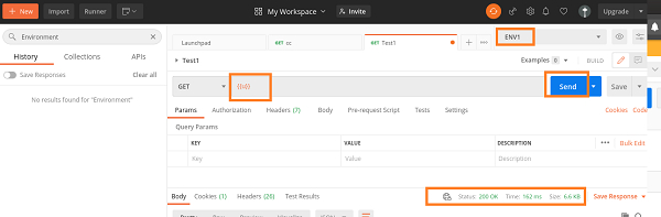 步驟 4 − 選擇 ENV1 環境並在位址列中新增 {{u}}。為在請求中保留環境變數,我們必須用雙花括號 {{<環境變數名稱>}} 將其括起來。