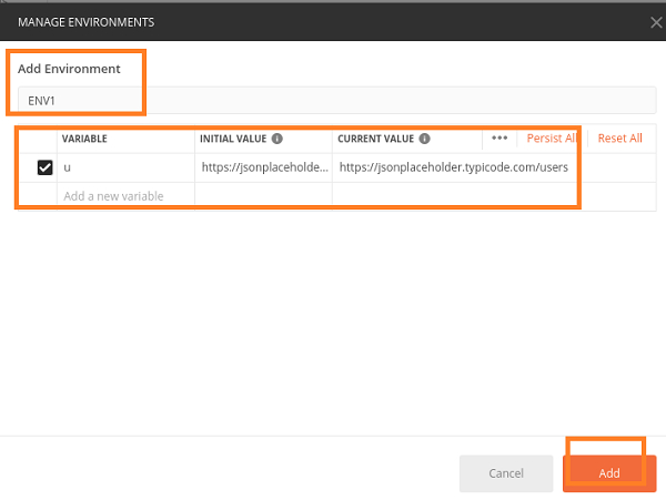 步驟 2 − “管理環境”彈出視窗開啟。我們將輸入環境名稱。在此,我們添加了變數 u 和值https://jsonplaceholder.typicode.com/users。然後關閉彈出視窗。