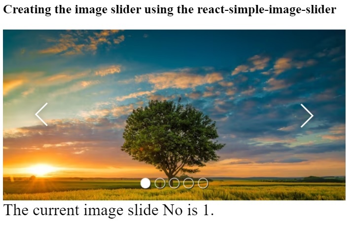 import React, { useState } from "react"; import SimpleImageSlider from "react-simple-image-slider"; export default function App() { const [imageNum, setImageNum] = useState(1); const sliderImages = [ { url: "https://img.freepik.com/free-photo/wide-angle-shot-singletree-growing-clouded-sky-during-sunset-surrounded-by-grass_181624-22807.jpg", }, { url: "https://thumbs.dreamstime.com/b/lone-tree-meadow-sunriseidyllic-fabulous-landscapes-39659821.jpg", }, { url: "https://encryptedtbn0.gstatic.com/images?q=tbn:ANd9GcSprPgYofGmXXPfuEDcZ_XI294n0bME5dTX9TGvINmPiA&s", }, { url: "https://i.pinimg.com/474x/81/ca/47/81ca47eaae35615ba9a9bb57560aaa3c.jpg", }, { url: "https://encryptedtbn0.gstatic.com/images?q=tbn:ANd9GcTof2fniv0mZzN8DByLmb6ILU4MvV_SGr_wptMeAut_dPaYMBkeHnHhD5egzU7MB0GSqE&usqp=CAU", }, ]; return ( <div> <h3> {" "} Creating the image slider using the react-simple-image-slider </h3> <SimpleImageSlider width={500} height={250} images={sliderImages} showBullets={true} showNavs={true} autoPlay={true} onStartSlide = {(index, length) => { setImageNum(index); }} autoPlayDelay = {3} /> <div style = {{ fontSize: "1.5rem" }}> The current image slide No is {imageNum}. </div> </div> ); }