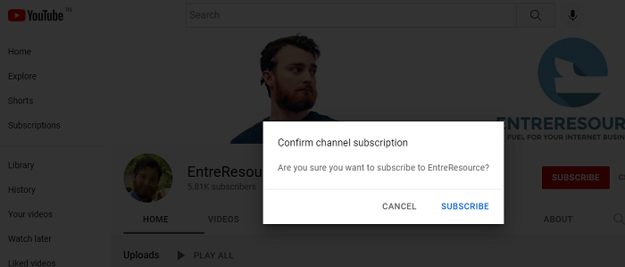 例如 − 我正在使用 EntreResource YouTube 頻道連結(如下所示)