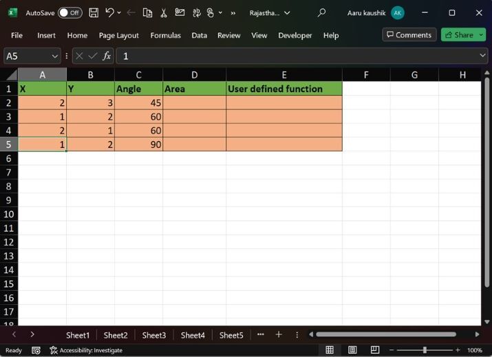 使用者學習了在僅給出三角形的兩條邊值和一個角度的情況下計算三角形面積的技巧。使用者必須在模組中正確編寫函式的正確語法、變數宣告和麵積公式才能獲得正確的結果。VBA函式中的縮排部分是可選的。