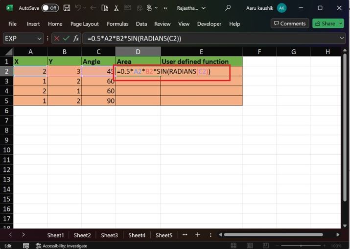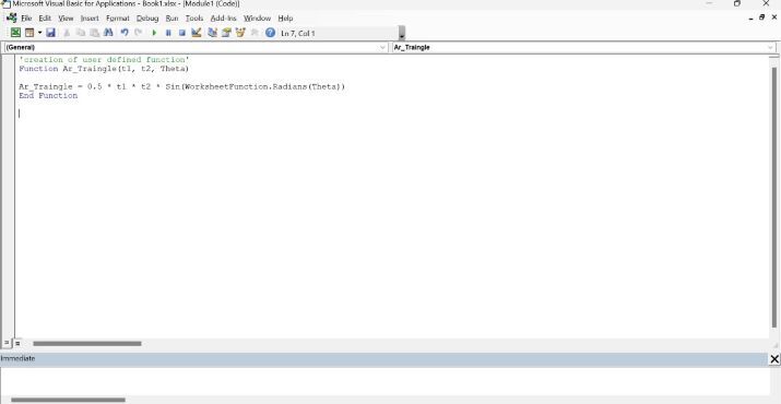 'creation of user defined function' Function Ar_Traingle(t1, t2, Theta) 'compute formula' Ar_Traingle = 0.5 * t1 * t2 * Sin(WorksheetFunction.Radians(Theta)) End Function