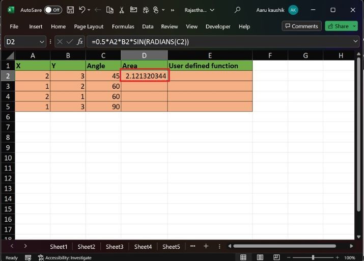 在D2單元格中輸入公式=0.5*A2*B2*SIN(RADIANS(C2))以計算三角形的面積,然後按“Enter”鍵。