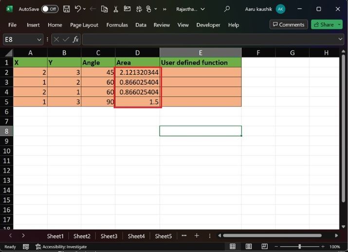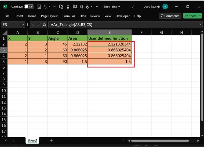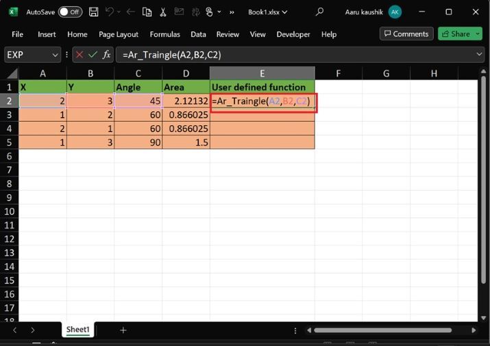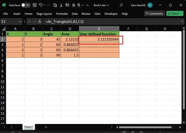儲存工作表,然後切換到Excel工作表,在E2單元格中鍵入UDF=Ar_Triangle(A2,B2,C2)。使用者需要在函式中提供正確的單元格引用,否則可能會出現錯誤。然後按“Enter”鍵以獲得計算的面積。