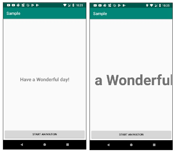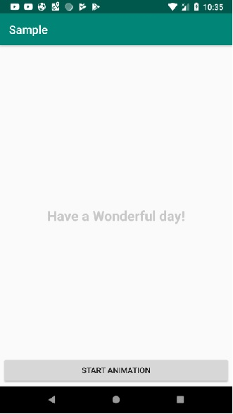 <?xml version="1.0" encoding="utf-8"?> <RelativeLayout xmlns:android="http://schemas.android.com/apk/res/android" xmlns:tools="http://schemas.android.com/tools" android:layout_width="match_parent" android:padding="4dp" android:layout_height="match_parent" tools:context=".MainActivity"> <TextView android:textSize="24sp" android:textStyle="bold" android:layout_width="wrap_content" android:layout_height="wrap_content" android:text="Have a Wonderful day!" android:layout_centerInParent="true" android:id="@+id/textView" /> <Button android:id="@+id/button" android:layout_alignParentBottom="true" android:layout_width="match_parent" android:layout_height="wrap_content" android:text="Start Animation"/> </RelativeLayout>