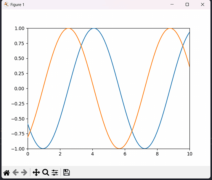 呼叫“init()”函式來初始化繪圖。我們設定“ax”的 x 和 y 限制,並返回“x1_line”和“x2_line”物件。接下來,動畫的每一幀都會呼叫“animate()”函式,它更新“x1_line”和“x2_line”物件的資料。我們生成一個包含 0 到 10 之間 100 個點的 numpy 陣列“x1”,以及一個幅度為 1、相移為 -i/10.0 的正弦波 numpy 陣列“y1”。然後,我們將“x1_line”的 x 資料設定為“x1”,y 資料設定為“y1”。
