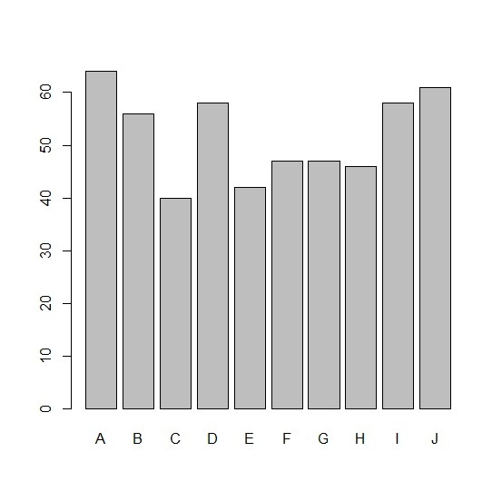 Category<-LETTERS[1:20] count<-rpois(20,50) df<-data.frame(Category,count) barplot(df$count[1:10],names.arg=df$Category[1:10])