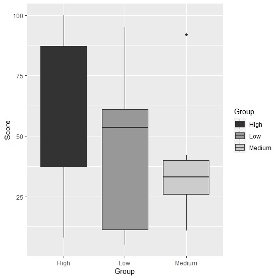 ggplot(df,aes(Group,Score,fill=Group))+geom_boxplot()+scale_fill_grey()輸出