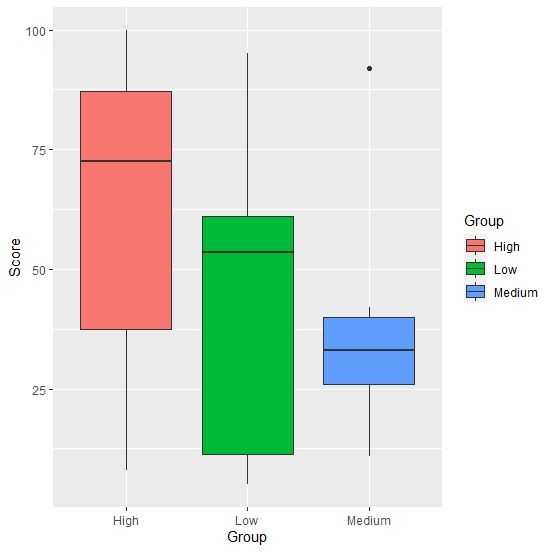 ggplot(df,aes(Group,Score,fill=Group))+geom_boxplot()輸出