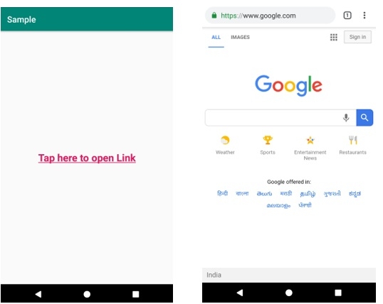<resources> <string name="app_name">Sample</string> <string name="messageWithLink"><a href="https://www.google.com/">Tap here to open Link</a></string> </resources>