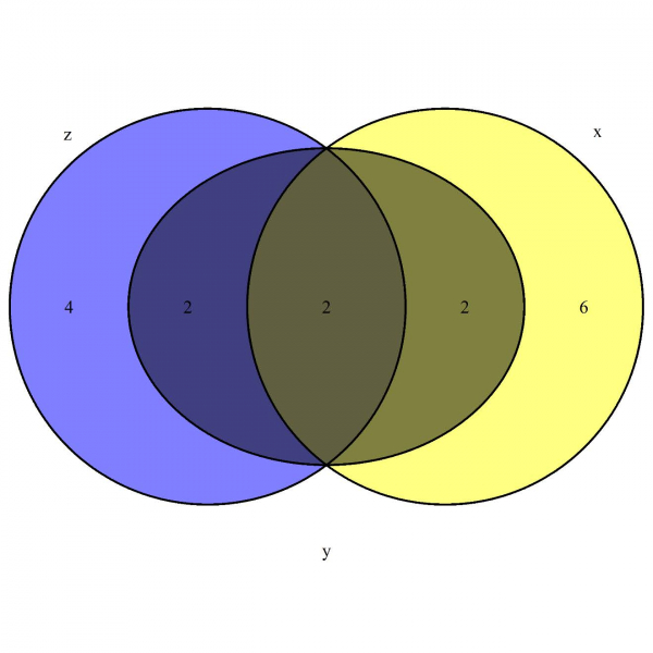 venn.diagram(list(x=1:10,y=7:12,z=9:16),fill=c("yellow","black","blue"), + filename = "Example2.tiff")