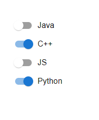 import React from "react"; import { FormControl, FormControlLabel, FormGroup, Switch } from "@mui/material"; import { useState } from "react"; const App = () => { const [swt, setSwt] = useState({ java: false, cpp: true, javascript: false, python: true, }); const handleSwitch = (e) => { setSwt({ ...swt, [e.target.name]: e.target.checked, }); }; return ( <div style={{ padding: 40, width: '50%' }}> <FormControl component="fieldset" variant="standard"> <FormGroup> <FormControlLabel control={ <Switch checked={swt.java} onChange={handleSwitch} inputProps={{ 'aria-label': 'controlled-switch' }} name="java" /> } label="Java" /> <FormControlLabel control={ <Switch checked={swt.cpp} onChange={handleSwitch} inputProps={{ 'aria-label': 'controlled-switch' }} name="cpp" /> } label="C++" /> <FormControlLabel control={ <Switch checked={swt.javascript} onChange={handleSwitch} inputProps={{ 'aria-label': 'controlled-switch' }} name="javascript" /> } label="JS" /> <FormControlLabel control={ <Switch checked={swt.python} onChange={handleSwitch} inputProps={{ 'aria-label': 'controlled-switch' }} name="python" /> } label="Python" /> </FormGroup> </FormControl> </div> ); }; export default App;