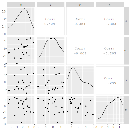set.seed(212) x<−rnorm(20) y<−rnorm(20) z<−rnorm(20) a<−rnorm(20) df<−data.frame(x,y,z,a) df