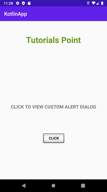 <?xml version="1.0" encoding="utf-8"?> <RelativeLayout xmlns:android="http://schemas.android.com/apk/res/android" xmlns:tools="http://schemas.android.com/tools" android:id="@+id/activity_main" android:layout_width="match_parent" android:layout_height="match_parent" tools:context="MainActivity"> <Button android:id="@+id/buttonShowCustomDialog" style="@android:style/Widget.DeviceDefault.Button.Inset" android:layout_width="wrap_content" android:layout_height="wrap_content" android:layout_alignParentBottom="true" android:layout_centerHorizontal="true" android:layout_marginBottom="131dp" android:onClick="exit" android:text="Click" android:textStyle="normal|bold" /> <TextView android:id="@+id/textView" android:layout_width="match_parent" android:layout_height="wrap_content" android:layout_above="@+id/buttonShowCustomDialog" android:layout_centerHorizontal="true" android:layout_marginBottom="86dp" android:gravity="center" android:text="CLICK TO VIEW CUSTOM ALERT DIALOG" android:textSize="18sp" android:textStyle="normal|bold" /> </RelativeLayout>