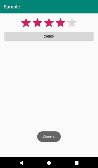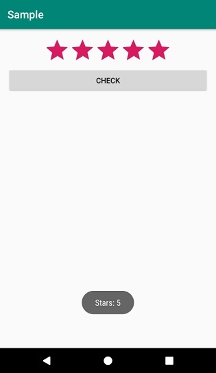 <?xml version="1.0" encoding="utf-8"?> <RelativeLayout xmlns:android="http://schemas.android.com/apk/res/android" xmlns:tools="http://schemas.android.com/tools" android:layout_width="match_parent" android:layout_height="match_parent" android:padding="16sp" tools:context=".MainActivity"> <RatingBar android:layout_width="wrap_content" android:layout_height="wrap_content" android:numStars="5" android:rating="2.0" android:stepSize="1.0" android:layout_alignParentTop="true" android:layout_centerHorizontal="true" android:id="@+id/ratingBar"/> <Button android:text="CHECK" android:layout_width="match_parent" android:layout_height="wrap_content" android:layout_below="@id/ratingBar" android:layout_centerHorizontal="true" android:id="@+id/buttonCheck"/> </RelativeLayout>