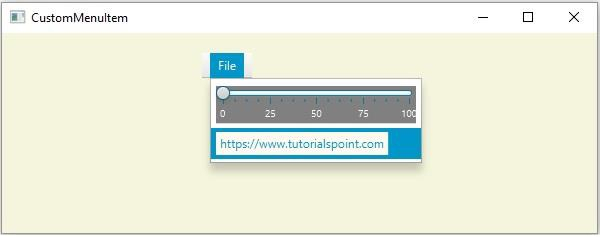 JavaFX 提供了一個名為 javafx.scene.control.CustomMenuItem 的類(MenuItem 的子類),您可以在其中嵌入任意節點,即使用此類,您可以將任意節點(如滑塊、超連結等)新增到選單中。
