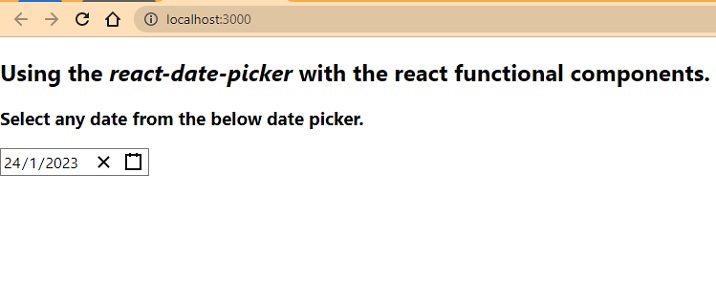 import React, { useState } from "react"; import DatePicker from "react-date-picker"; export default function App() { const [dateValue, onDateChange] = useState(new Date()); return ( <> <h2> Using the <i> react-date-picker </i> with the react functional components.{" "} </h2> <h3>Select any date from the below date picker.</h3> <div> <DatePicker onChange={onDateChange} value={dateValue} /> </div> </> ); }