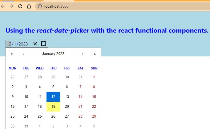 import React, { useState } from "react"; import DatePicker from "react-date-picker"; export default function App() { const [dateValue, onDateChange] = useState(new Date()); const mystyle = { color: "blue", backgroundColor: "lightblue", padding: "2rem", }; return ( <> <div style={mystyle}> <h2> Using the<i>react-date-picker</i>with the react functional components. </h2> <div> <DatePicker onChange={onDateChange} value={dateValue} autoFocus={true} className="date-picker" closeCalendar={false} /> </div> </div> </> ); }