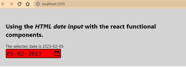 import React, { useState } from "react"; export default function App() { const [date, setDate] = useState("none"); const onDateChange = (event) => { setDate(event.target.value); }; const mystyle = { color: "black", backgroundColor: "lightgrey", padding: "2rem", width: "700px", }; const dateStyle = { backgroundColor: "red", width: "13.2rem", height: "2rem", fontSize: "1.5rem", }; return ( <> <div style={mystyle}> <h2> Using the <i>HTML date input </i> with the react functional components. </h2> The selected date is {date} <div> <input type="date" style={dateStyle} value={date} onChange={onDateChange} /> </div> </div> </> ); }