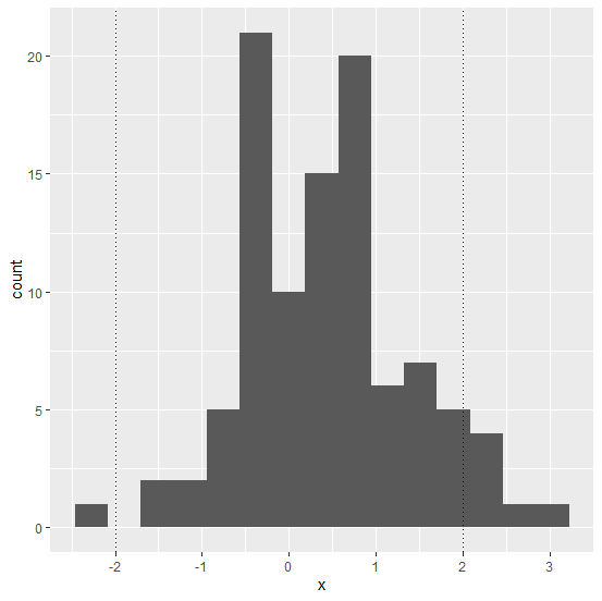 library(ggplot2) ggplot(df,aes(x))+geom_histogram(bins=15)+geom_vline(xintercept=c(-2,2),linetype="dotted")