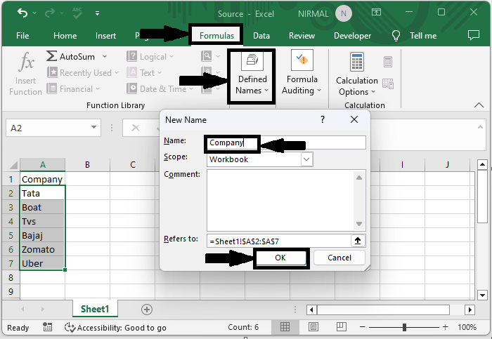 然後在另一個工作表中,單擊“公式”,然後單擊“定義名稱”。然後輸入名稱並將其輸入為“Source.xlxs!Company”,然後單擊“確定”。