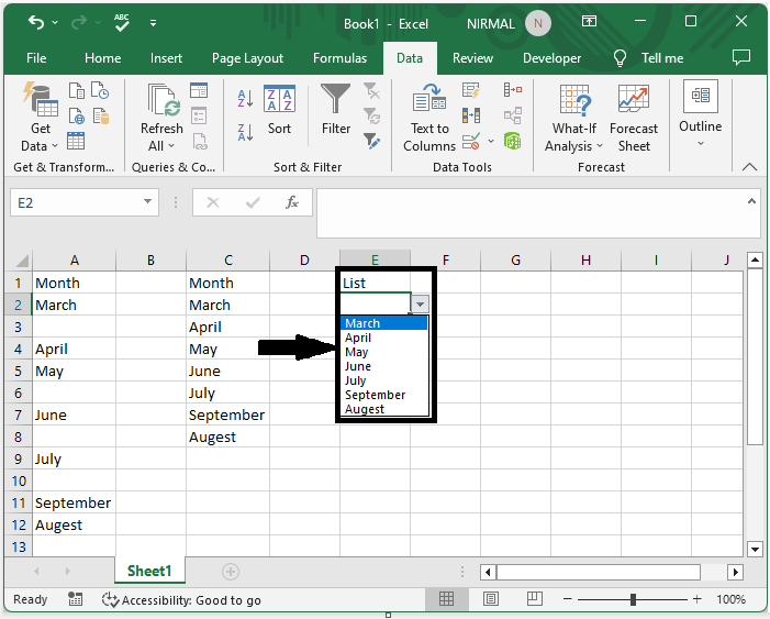 現在單擊一個空單元格(在本例中為單元格E2),然後單擊“資料”,然後選擇“資料驗證”。
