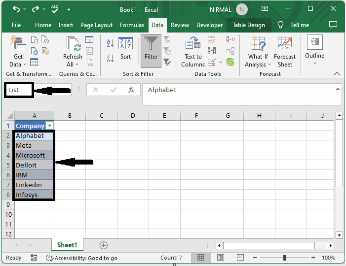 現在,選擇表格,點選名稱框,輸入“List”,然後按“回車”。