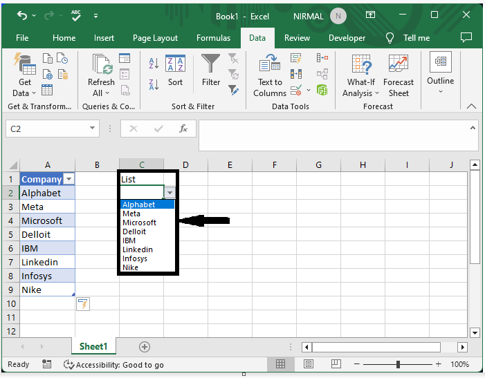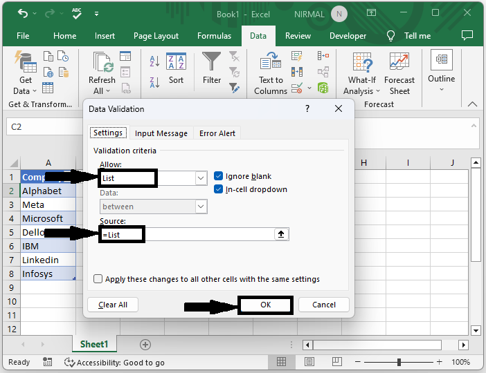 最後,點選一個空單元格,點選資料,選擇資料驗證,將允許設定為列表,將來源設定為List,然後點選確定以完成我們的任務。