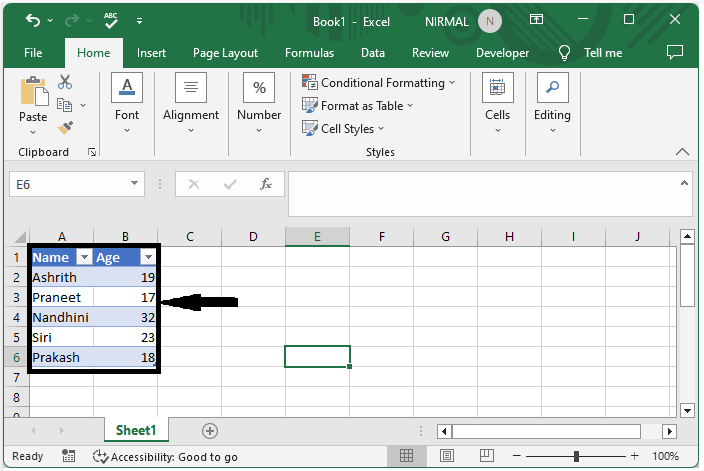 現在,再次選擇單元格區域,然後使用命令CTRL + T並單擊回車鍵將資料轉換為表格格式。