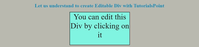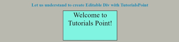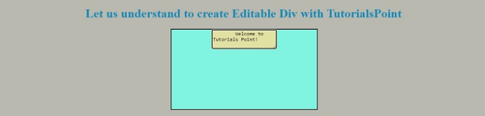 <h1 style="color: rgb(12, 139, 185); text-align: center;"> Let us understand to create Editable Div with TutorialsPoint </h1> <div style="text-align: center; margin-left: 35%;" class="container"> <div id="myFirstDiv"></div> </div>