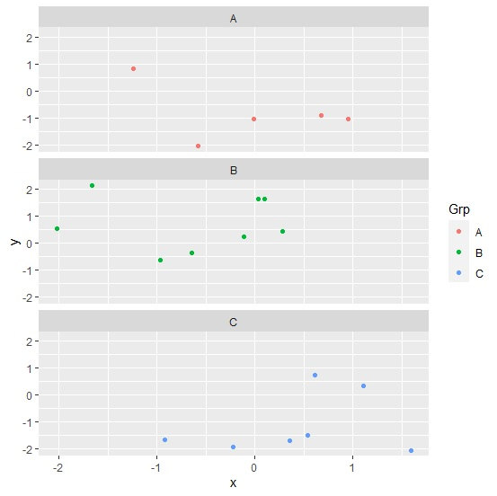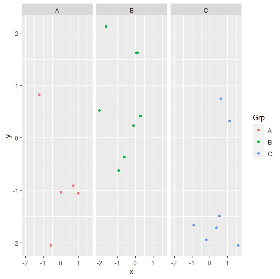 x<-rnorm(20) y<-rnorm(20) Grp<-sample(LETTERS[1:3],20,replace=TRUE) df<-data.frame(x,y,Grp) library(ggplot2) ggplot(df,aes(x,y,col=Grp))+geom_point()+facet_grid(~Grp)
