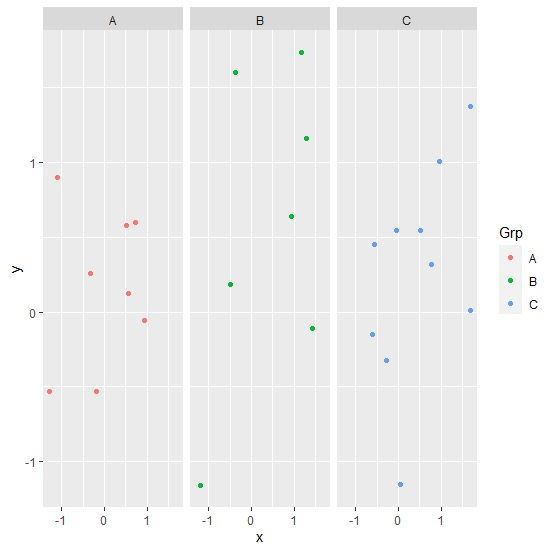 x<-rnorm(25) y<-rnorm(25) Grp<-sample(LETTERS[1:3],25,replace=TRUE) df<-data.frame(x,y,Grp) library(ggplot2) ggplot(df,aes(x,y,col=Grp))+geom_point()+facet_grid(~Grp)