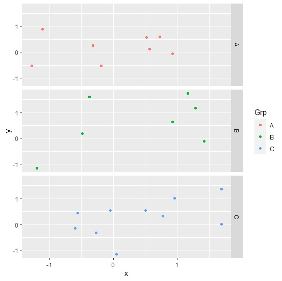 x<-rnorm(25) y<-rnorm(25) Grp<-sample(LETTERS[1:3],25,replace=TRUE) df<-data.frame(x,y,Grp) library(ggplot2) ggplot(df,aes(x,y,col=Grp))+geom_point()+facet_grid(Grp~.)