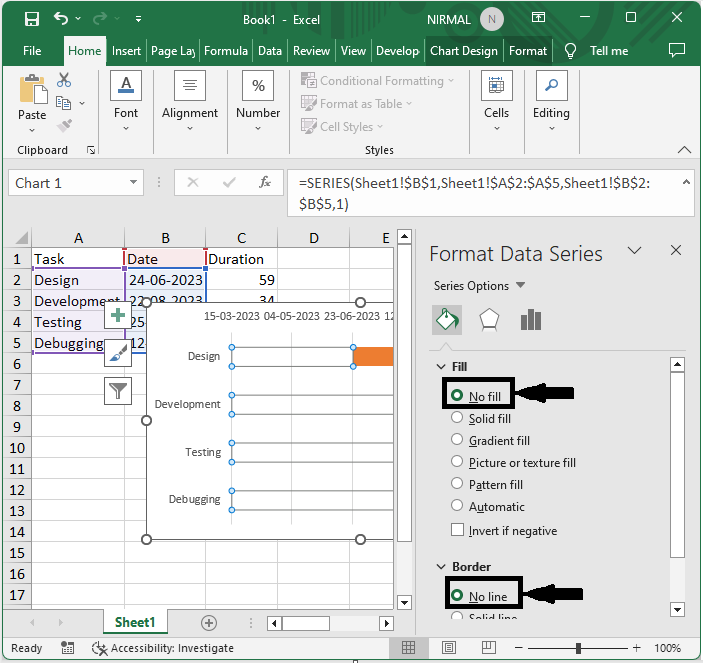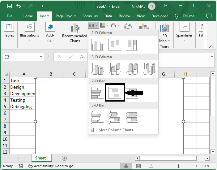 這裡,我們將首先建立一個空的堆疊圖表,然後向圖表中新增資料,最後格式化圖表以完成任務。讓我們來看一個簡單的流程,學習如何在Excel中建立甘特圖。