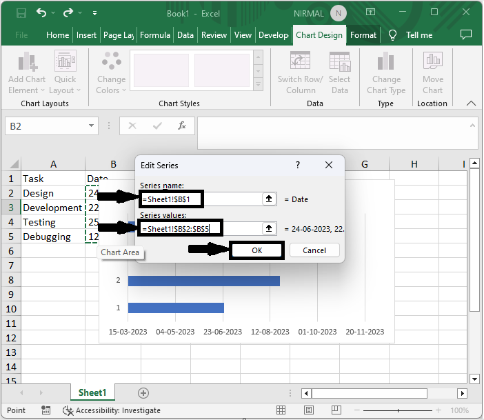 然後右鍵單擊圖表,單擊“選擇資料”,然後單擊“圖例項”下的“新增”。然後,對於“系列名稱”,單擊單元格B1,對於“系列值”,選擇單元格B1下的單元格,然後單擊“確定”。