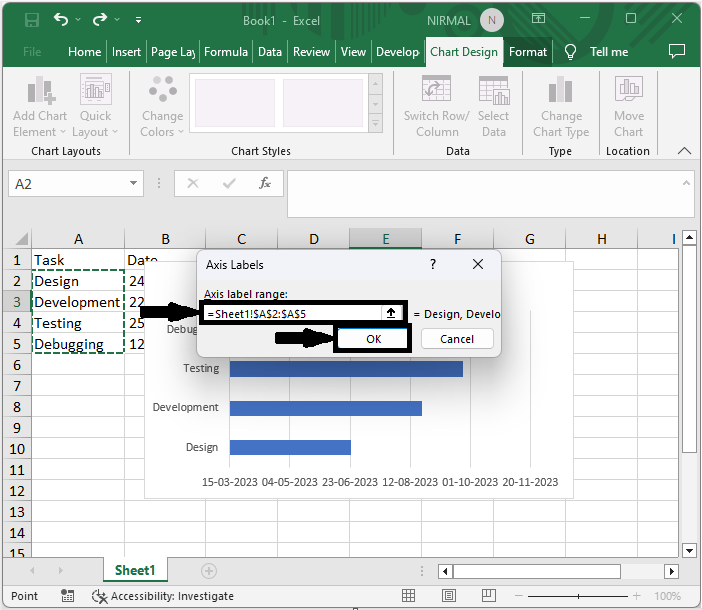 然後單擊“水平軸標籤”下的“編輯”,選擇任務名稱,然後單擊“確定”。