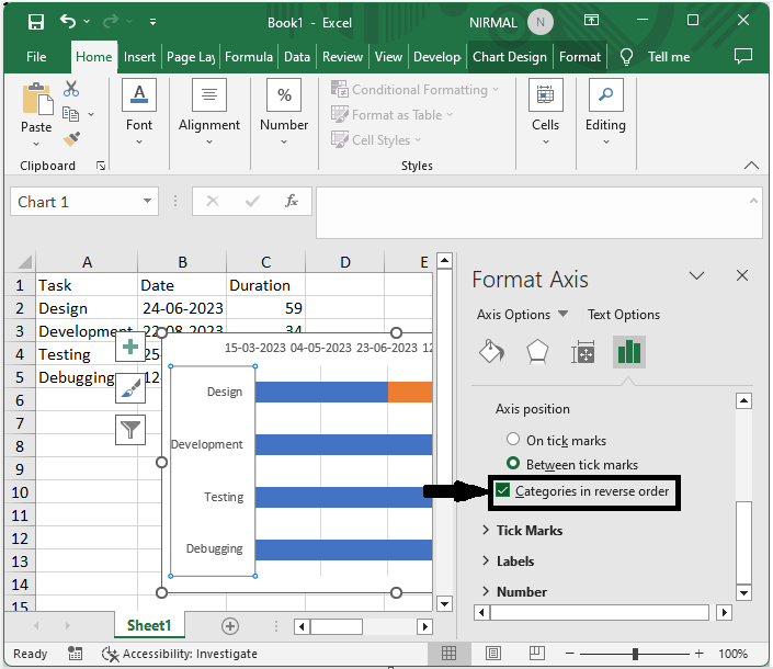 現在右鍵單擊Y軸,選擇“設定座標軸格式”,然後選中名為“按相反順序分類”的複選框。