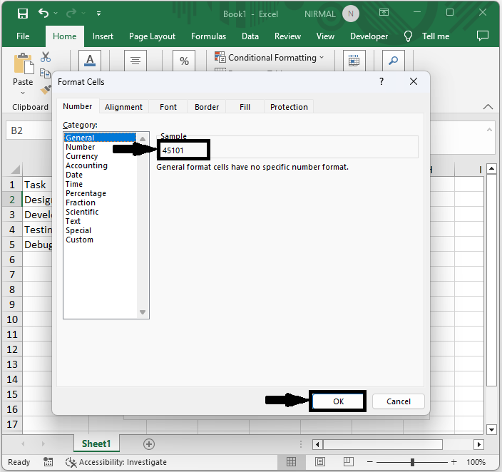 然後右鍵單擊單元格B2,選擇“設定單元格格式”,然後單擊“常規”,並記下您看到的數值。