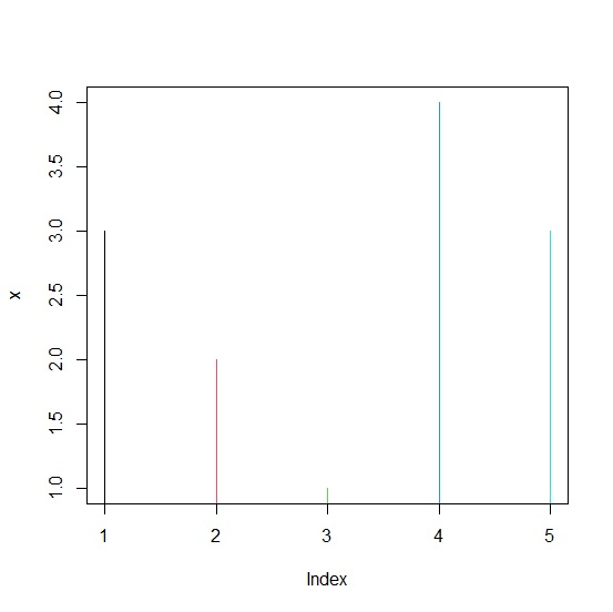 x<-rpois(5,2) plot(x,type="h",col=1:5)