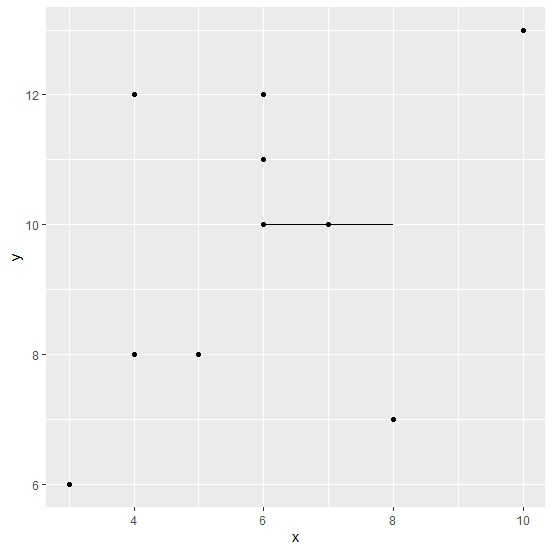 ggplot(df,aes(x,y))+geom_point()+geom_line(data=data.frame(x=6:8,y=10))