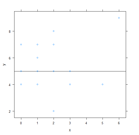 x<-rpois(20,2) y<-rpois(20,5) df<-data.frame(x,y) library(lattice) xyplot(y~x,df,abline=c(h=5))