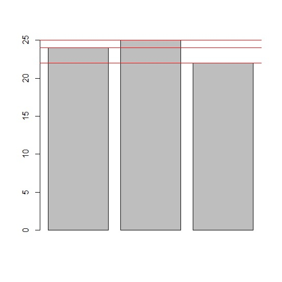 x<-c(24,25,22) barplot(x) abline(h=c(24,25,22),col="red")